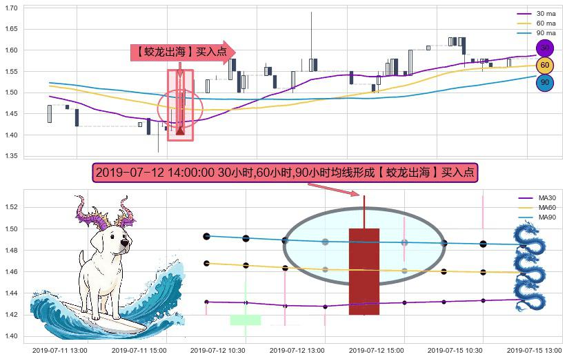 形态多维评估: ⚀ 2019-07-12 14:00:00小时显现 30小时-60小时-90小时均线 【蛟龙出海】买入点 看多信号,后市看涨,买入