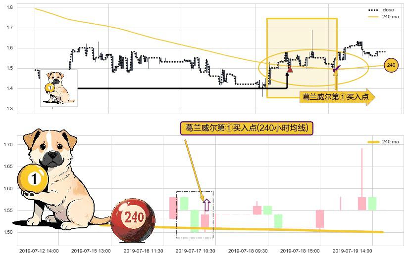 形态多维评估: ⚀ 2019-07-17 09:30:00-小时显现 葛兰威尔均线 240小时均线 第买①入点 走势反转见底信号,后市看涨,买进信号