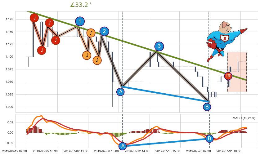 ➣ 2019-06-19 09:30-2019-07-26 11:30下跌趋势存在反转上涨[机会],其原下跌趋势的阻力位(1.0538)已被突破[强支撑信号],原下跌趋势角度: 33.2˚