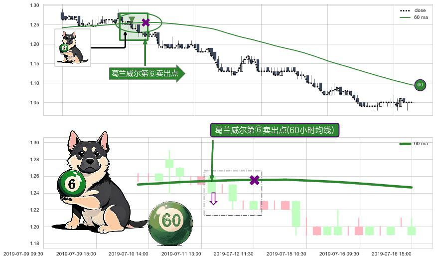 形态多维评估: ⚀ 2019-07-11 14:00:00-小时显现 葛兰威尔均线 60小时均线 第⑥卖出点 走势反转见顶信号,后市看跌,卖出信号