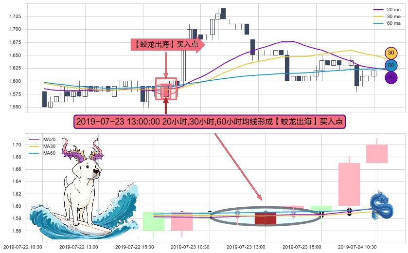 形态多维评估: ⚀ 2019-07-23 13:00:00小时显现 20小时-30小时-60小时均线 【蛟龙出海】买入点 看多信号,后市看涨,买入