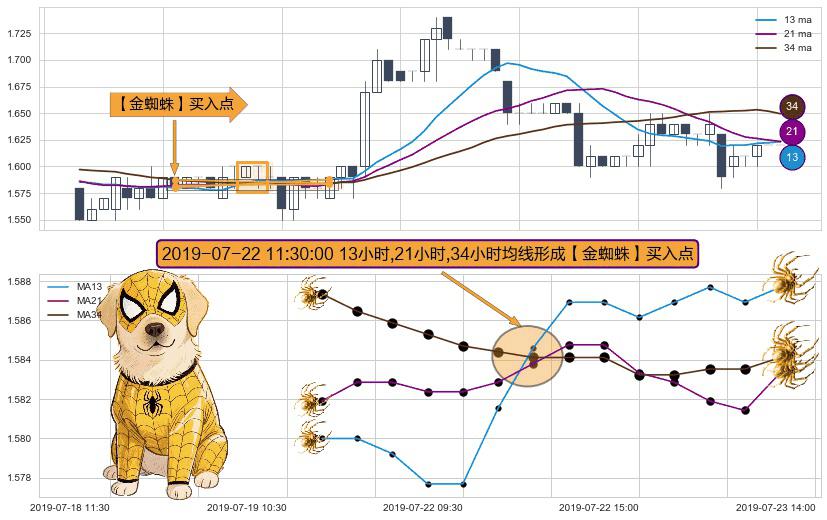 形态多维评估: ⚀ 2019-07-22 11:30:00小时显现 13小时-21小时-34小时均线 【金蜘蛛】买入点 看多信号,后市看涨,买入