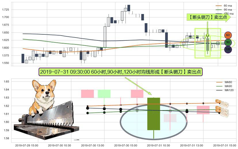 形态多维评估: ⚀ 2019-07-31 09:30:00小时显现 60小时-90小时-120小时均线 【断头铡刀】卖出点 看空信号,后市看跌,卖出