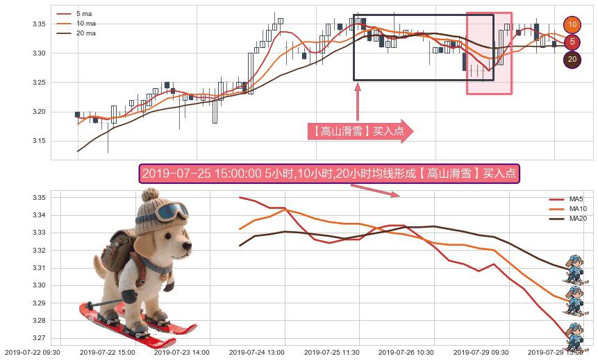 形态多维评估: ⚀ 2019-07-24 09:30:00小时-2019-07-29 14:00:00小时显现 5小时-10小时-20小时均线 【高山滑雪】买入点 看多信号,后市看涨,买入