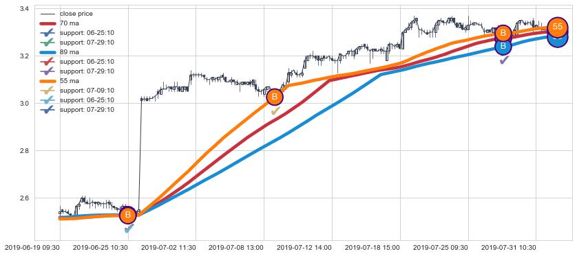上涨趋势06-19 09:30-07-31 15:00,均线89, 70, 55确认关键支撑3处
