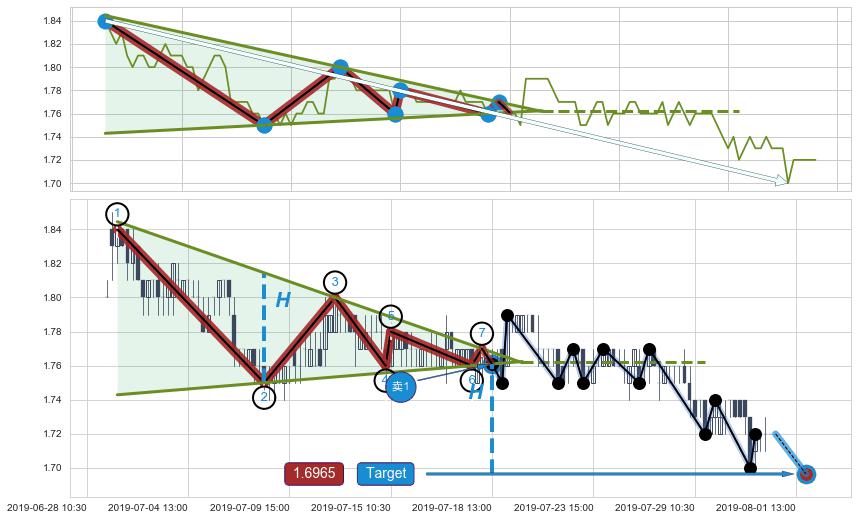 ➣ 预测:2019-08-19 12:00,【继续下探】稳定目前下跌趋势的前提下,预测价格:1.6745
