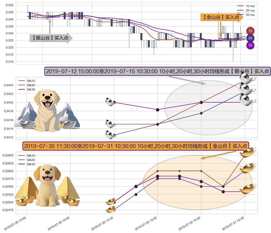 ⚃ 2019-07-30 13:00:00-小时至2019-07-31 10:30:00-小时显现 10小时-20小时-30小时均线 【金山谷】买入点 其再次确认了买入信号,可靠性更强,买入