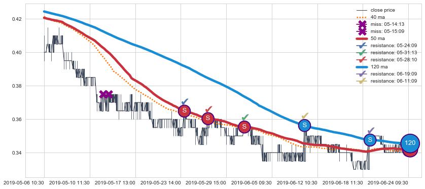 下跌趋势05-06 10:30-06-24 09:30,均线120, 50确认关键阻力5处