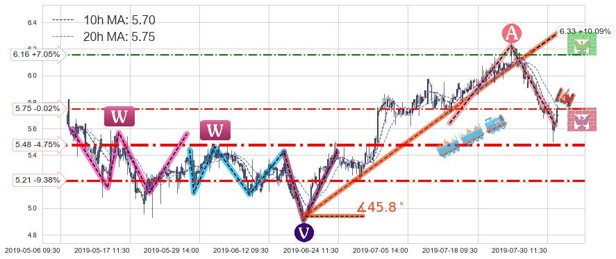 ♘ 支撑价格位5.48,可信任强度70.74%,距离最后交易2019-07-31 15:00形成的收盘价格5.75相差 -4.75%