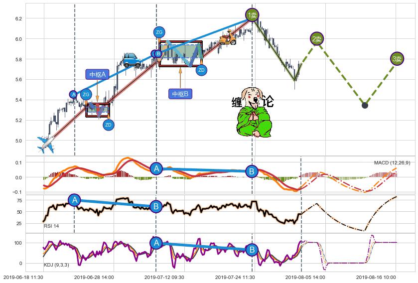 ➢ 【中枢A】:06-25:15-06-27:11,中枢由5笔构成,共10交易小时, ZG=5.33, ZD=5.30