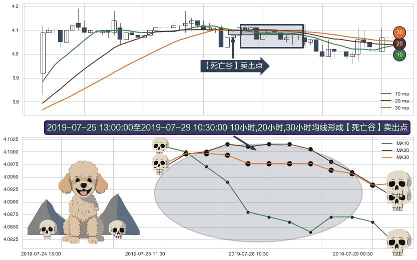 形态多维评估: ⚀ 2019-07-25 14:00:00-小时至2019-07-29 10:30:00-小时显现 10小时-20小时-30小时均线 【死亡谷】卖出点 看空信号,后市看跌,卖出
