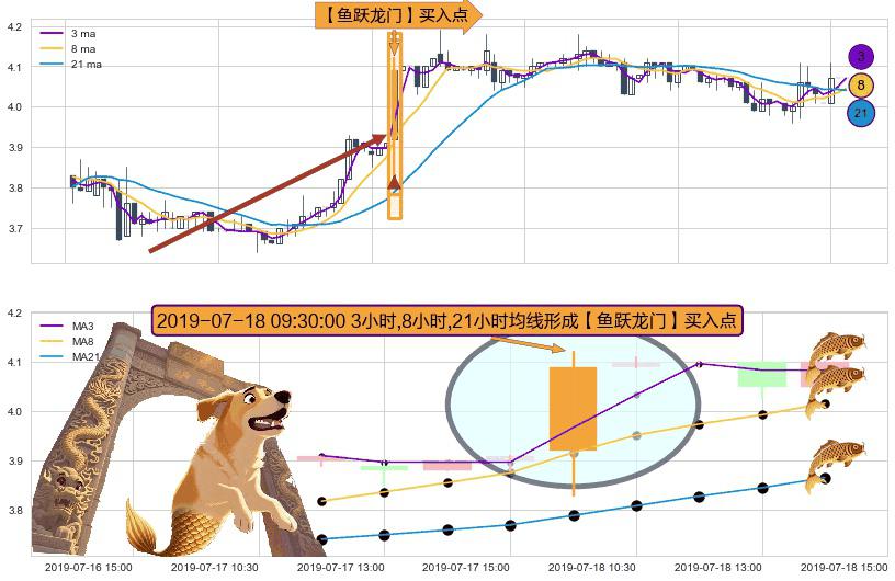 形态多维评估: ⚀ 2019-07-18 09:30:00小时显现 3小时-8小时-21小时均线 【鱼跃龙门】买入点 看多信号,后市看涨,买入