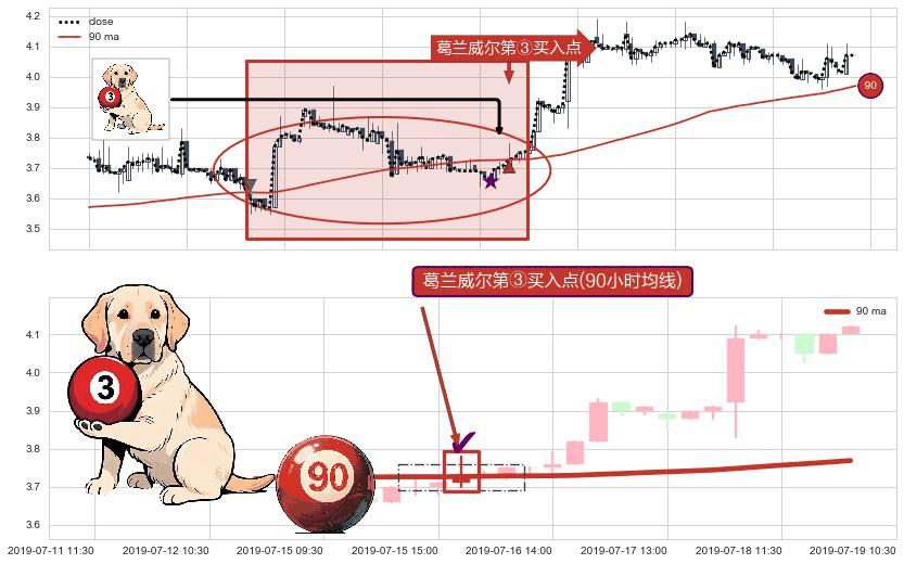 形态多维评估: ⚀ 2019-07-16 09:30:00-小时显现 葛兰威尔均线 90小时均线 第③买入点 上升趋势的中继信号,后市看涨,买进信号