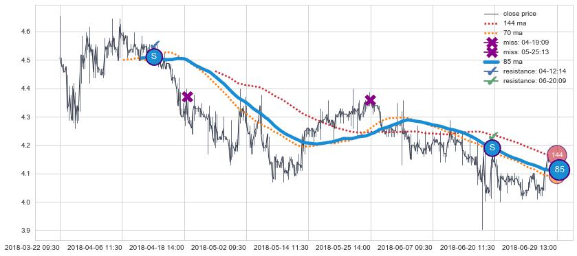 下跌趋势01-28 11:30-05-28 13:00,均线144, 85确认关键阻力1处