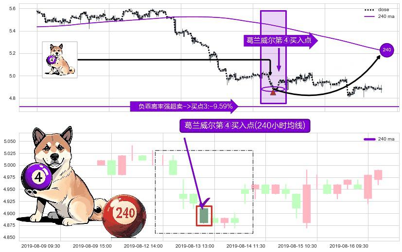 形态多维评估: ⚀ 2019-08-13 11:30:00-小时显现 葛兰威尔均线 240小时均线 第④买入点 下降趋势均值回复的短线反弹信号,后市看涨,买进信号