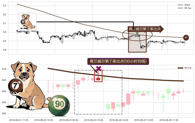 形态多维评估: ⚀ 2019-08-23 14:00:00-小时显现 葛兰威尔均线 90小时均线 第⑦卖出点 下降趋势的中继信号,后市看跌,卖出信号