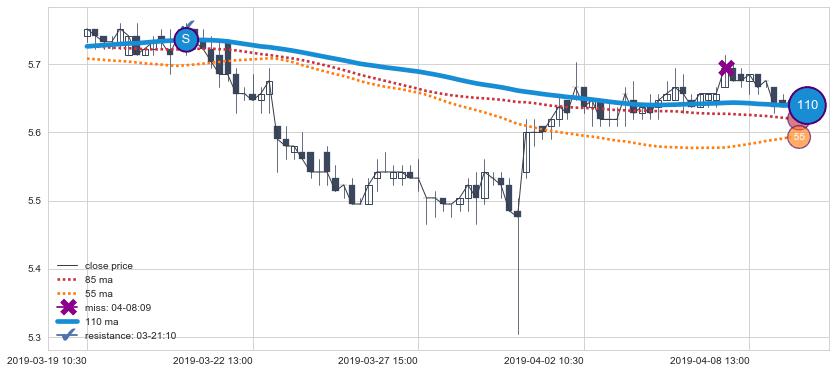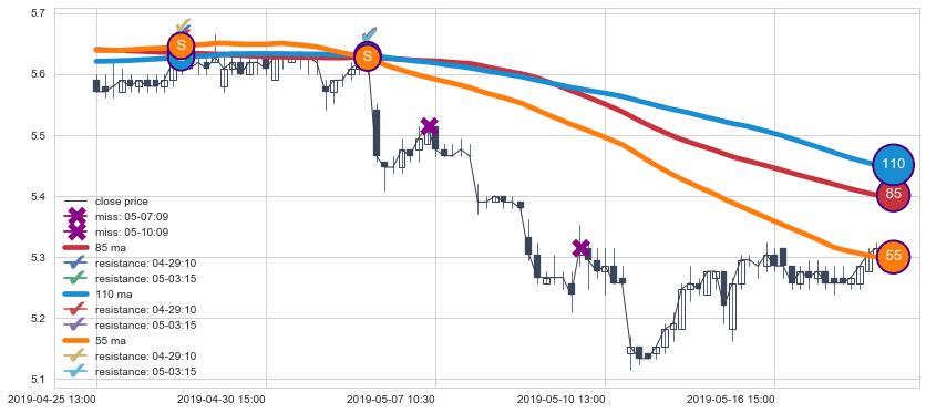 下跌趋势04-25 13:00-05-20 15:00,均线85, 110, 55确认关键阻力2处
