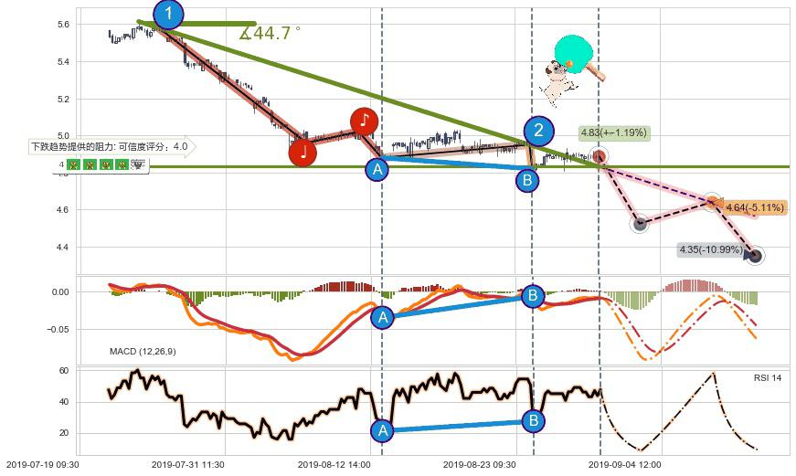 ➣ 预测:2019-09-09 12:00,【试探阻力】稳定目前下跌趋势的前提下,预测价格:4.64