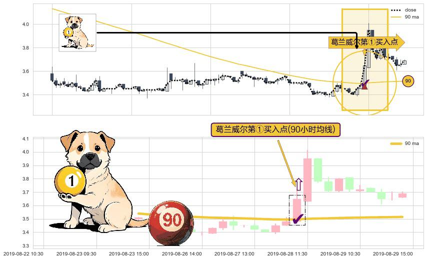 形态多维评估: ⚀ 2019-08-28 10:30:00-小时显现 葛兰威尔均线 90小时均线 第买①入点 走势反转见底信号,后市看涨,买进信号