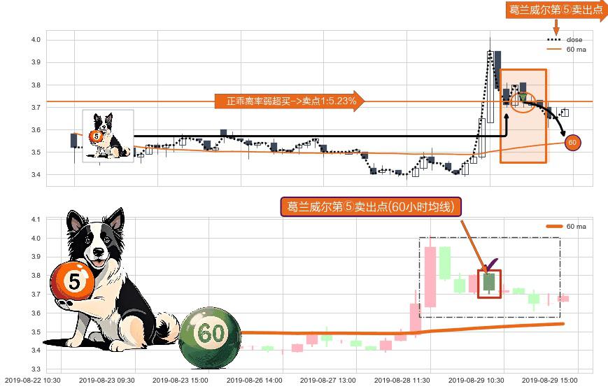 形态多维评估: ⚀ 2019-08-29 09:30:00-小时显现 葛兰威尔均线 60小时均线 第⑤卖出点 上升趋势均值回复的短线回落信号,后市看跌,卖出信号