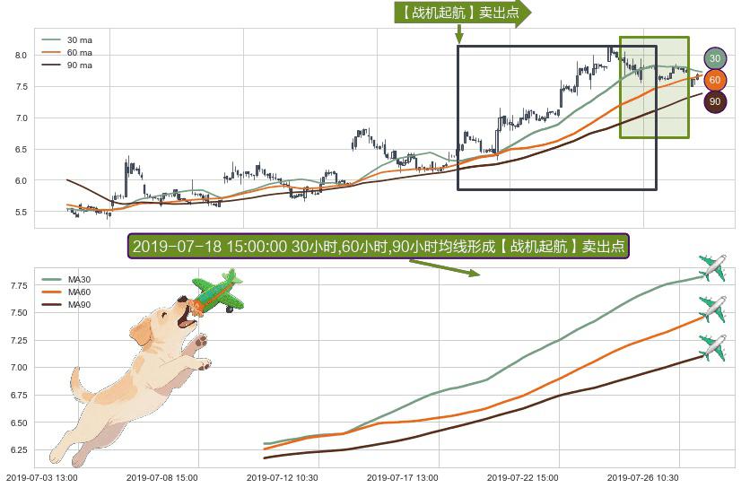 ⚀ 2019-07-10 14:00:00小时-2019-07-26 15:00:00小时显现 30小时-60小时-90小时均线 【战机起航】卖出点 看空信号,后市看跌,卖出
