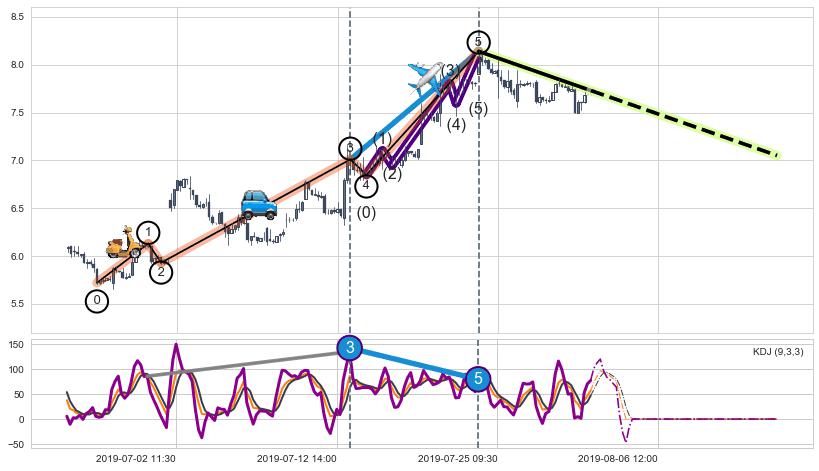 ➢ 第三,五驱动浪端点:【KDJ】走势出现【常规背离 & 反转信号】背离程度69.61%,背离夹角角度99.1˚,背离程度较大