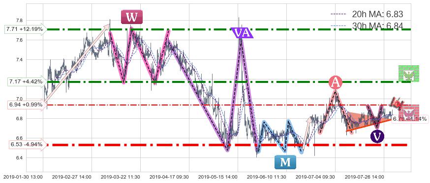 ♘ 阻力价格位7.71,可信任强度82.32%,距离最后交易2019-07-31 15:00形成的收盘价格6.87相差 +12.19%