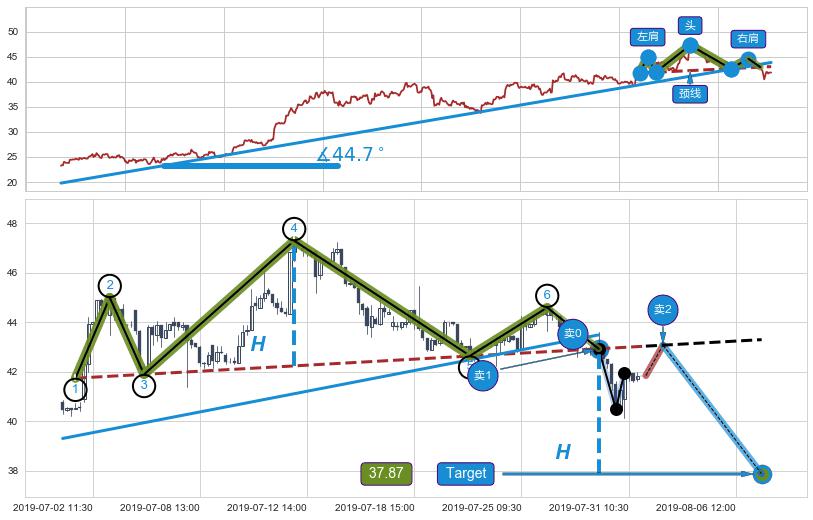 | 8 🅚:【断头铡刀】卖出点 ➕ 📐:头肩顶下行突破支撑位破位, 猜想持续下沉下跌,被突破的支撑位已变为阻力位 ☞ 看空信号 ⇥ 【均线】交织【图形】⇥ 综合量化分数: 19 | > |