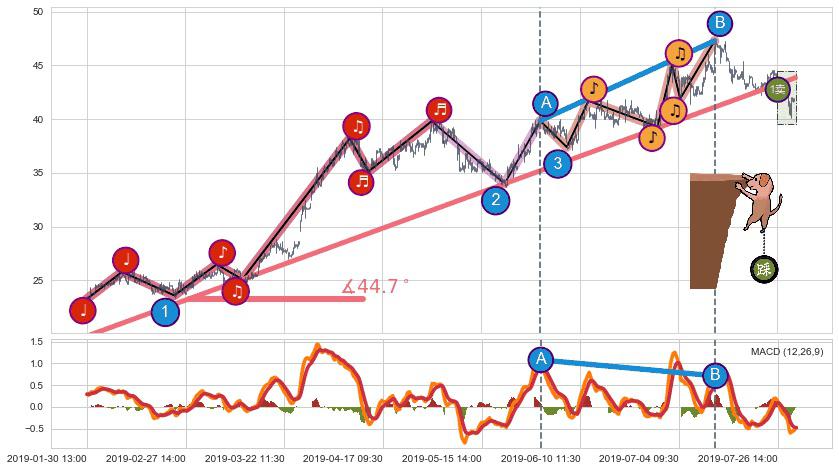 从2019-07-08 14:00至2019-07-23 09:30,共包含63个小时,阶段股价上涨1.22%,阶段股价变动位移路程比: 1 : 39