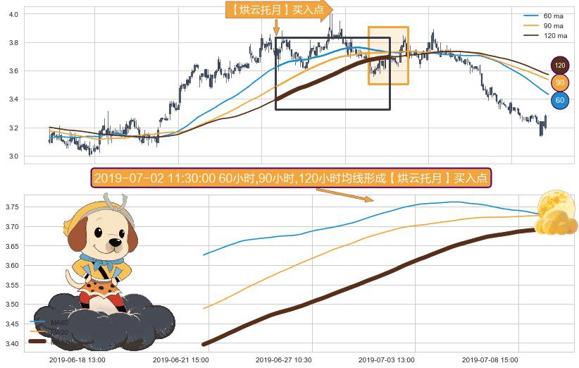 形态多维评估: ⚀ 2019-06-21 14:00:00小时-2019-07-09 15:00:00小时显现 60小时-90小时-120小时均线 【烘云托月】买入点 看多信号,后市看涨,买入