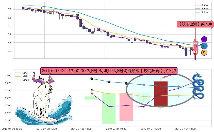 形态多维评估: ⚀ 2019-07-31 13:00:00小时显现 3小时-8小时-21小时均线 【蛟龙出海】买入点 看多信号,后市看涨,买入