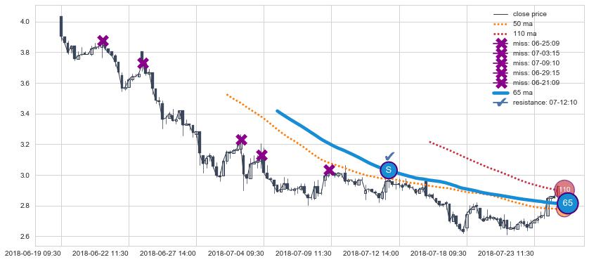 上涨趋势05-28 15:00-07-05 09:30,均线65, 50, 110确认关键支撑3处