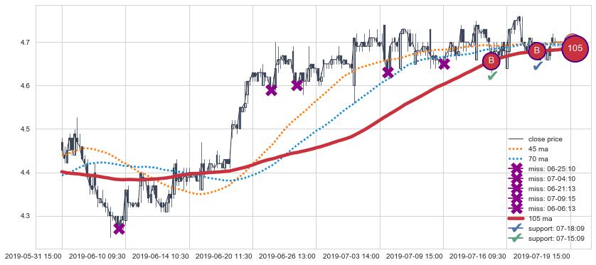 上涨趋势05-31 15:00-07-19 15:00,均线105确认关键支撑2处