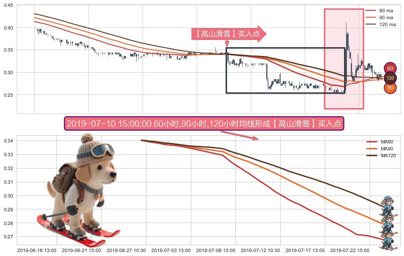 ⚀ 2019-06-26 15:00:00小时-2019-07-23 15:00:00小时显现 60小时-90小时-120小时均线 【高山滑雪】买入点 看多信号,后市看涨,买入
