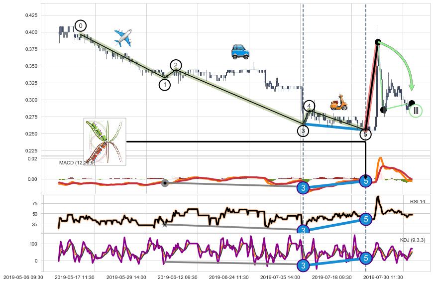 ➣ 1,3,5驱动浪MACD, RSI, KDJ走势都出现【常规背离】反转信号增强