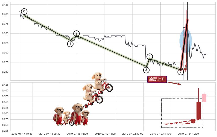 从2019-07-22 11:30至2019-07-31 15:00,共包含46个小时,阶段股价上涨20.38%,阶段股价变动位移路程比: 1 : 6