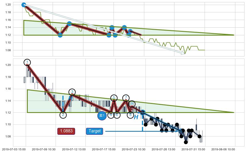 2019-07-10: 第一阻力位1.1210有效抑制了下跌浪,成功阻止了价格的继续下跌。