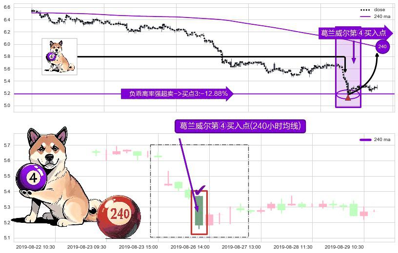 形态多维评估: ⚀ 2019-08-26 13:00:00-小时显现 葛兰威尔均线 240小时均线 第④买入点 下降趋势均值回复的短线反弹信号,后市看涨,买进信号