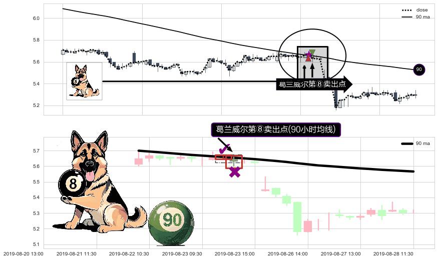 形态多维评估: ⚀ 2019-08-23 13:00:00-小时显现 葛兰威尔均线 90小时均线 第⑧卖出点 下降趋势的中继信号,后市看跌,卖出信号