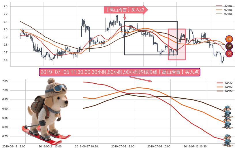 ⚀ 2019-06-25 15:00:00小时-2019-07-15 15:00:00小时显现 30小时-60小时-90小时均线 【高山滑雪】买入点 看多信号,后市看涨,买入