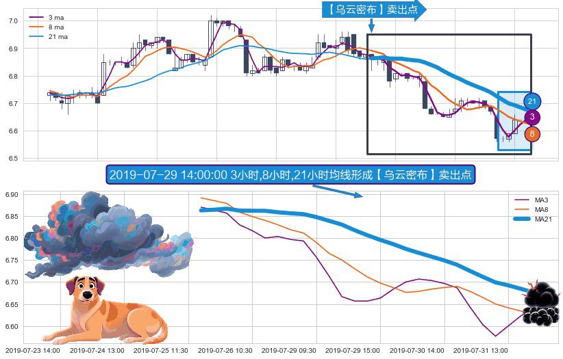 ⚀ 2019-07-25 13:00:00小时-2019-07-31 15:00:00小时显现 3小时-8小时-21小时均线 【乌云密布】卖出点 看空信号,后市看跌,卖出