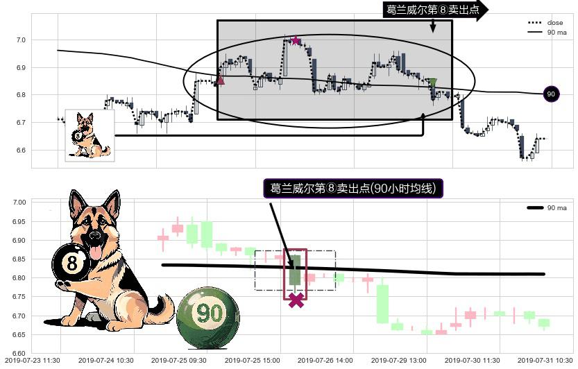 ⚀ 2019-07-26 09:30:00-小时显现 葛兰威尔均线 90小时均线 第⑧卖出点 下降趋势的中继信号,后市看跌,卖出信号