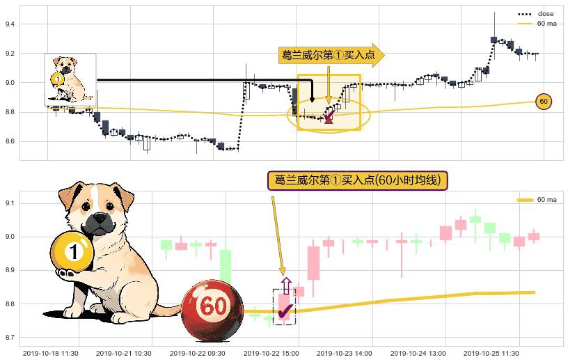 形态多维评估: ⚀ 2019-10-22 14:00:00-小时显现 葛兰威尔均线 60小时均线 第买①入点 走势反转见底信号,后市看涨,买进信号