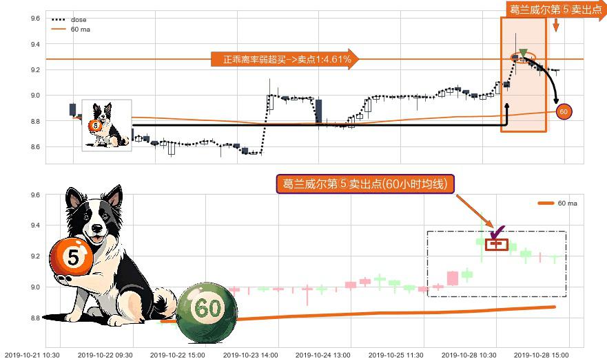 形态多维评估: ⚀ 2019-10-28 10:30:00-小时显现 葛兰威尔均线 60小时均线 第⑤卖出点 上升趋势均值回复的短线回落信号,后市看跌,卖出信号