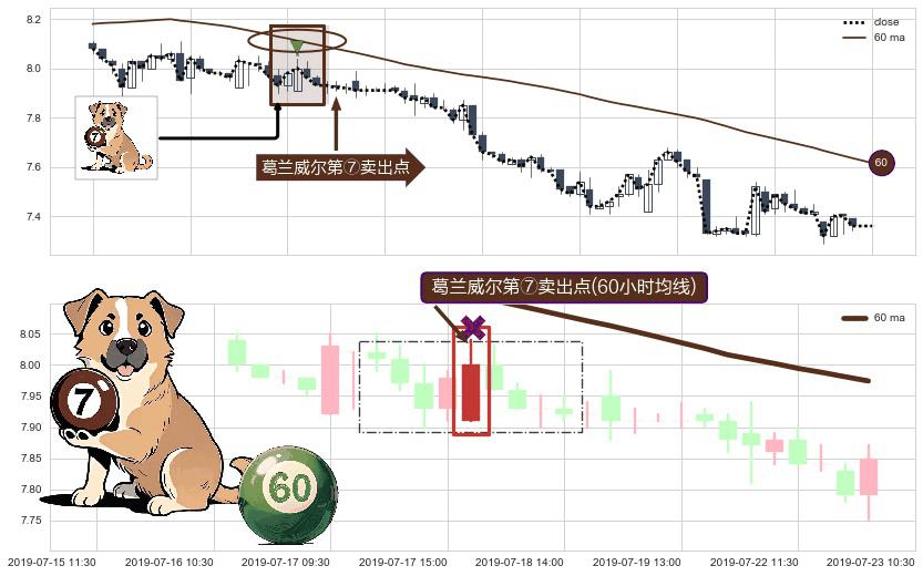 形态多维评估: ⚀ 2019-07-18 09:30:00-小时显现 葛兰威尔均线 60小时均线 第⑦卖出点 下降趋势的中继信号,后市看跌,卖出信号