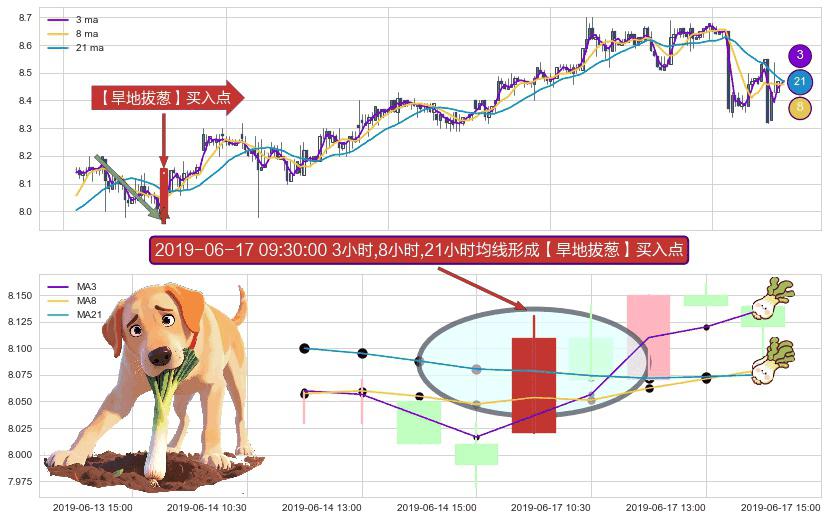 ⚀ 2019-06-17 09:30:00小时显现 3小时-8小时-21小时均线 【旱地拔葱】买入点 看多信号,后市看涨,买入