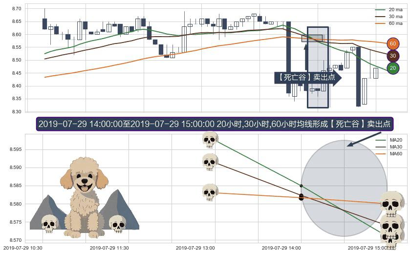 ⚀ 2019-07-29 15:00:00-小时至2019-07-29 15:00:00-小时显现 20小时-30小时-60小时均线 【死亡谷】卖出点 看空信号,后市看跌,卖出
