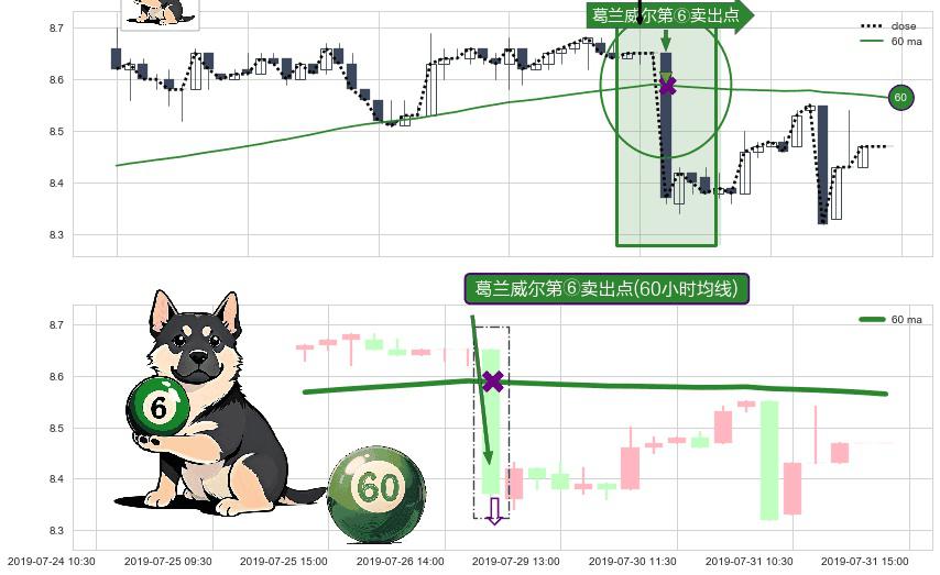 ⚀ 2019-07-29 09:30:00-小时显现 葛兰威尔均线 60小时均线 第⑥卖出点 走势反转见顶信号,后市看跌,卖出信号