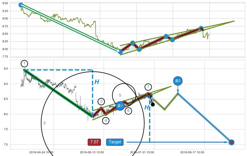 从2019-06-17 15:00至2019-07-22 14:00,共包含144个小时,阶段股价上涨7.02%,阶段股价变动位移路程比: 1 : 5