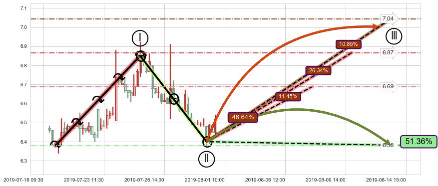 ➢ 循环浪继续向上【最低】位置(08-07:15, 6.69),匹配聚类样本比例23.55%, 可能性概率11.45%